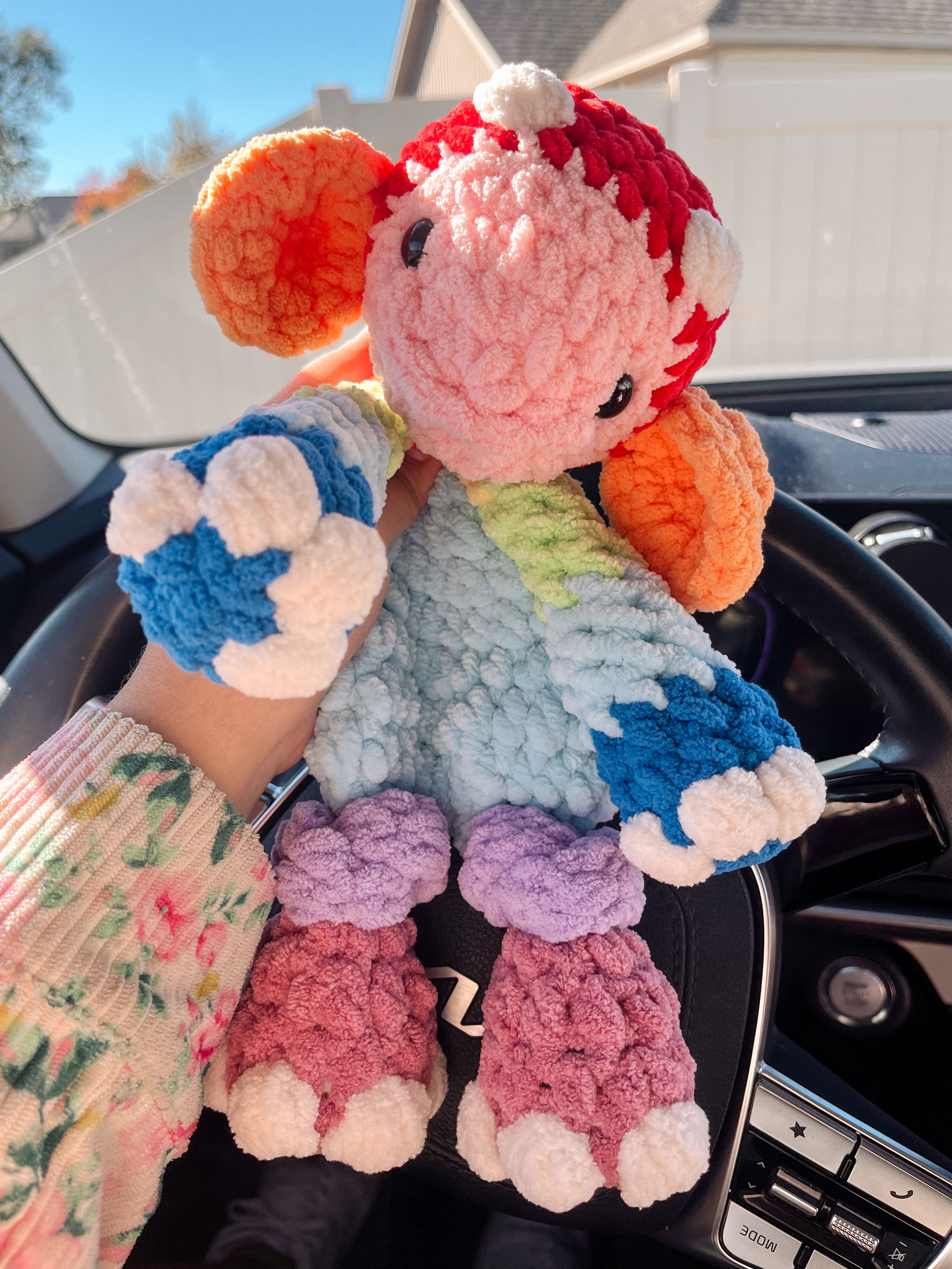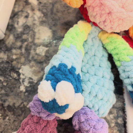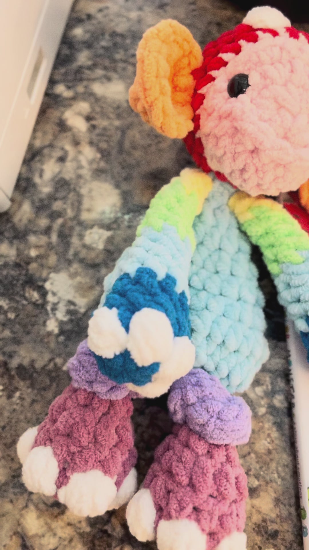 Made with Premier and Bernat Blanket yarn from head to tail. Head is filled with polyester fiber fill while the body lays flat, making it the perfect lovey to snuggle. Created with full rainbow blend representing every emotion.